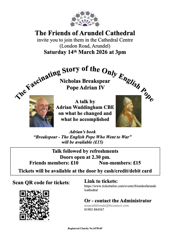 You can become more closely associated with this lovely building and its ministry by joining us, The Friends of Arundel Cathedral, whose task it is to raise awareness of the need to maintain the fabric of the building and its artefacts, for future generations to cherish and preserve in their turn. Membership is rewarding – and enjoyable!